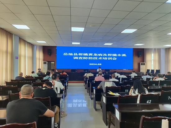 县农业农村局组织召开柑橘黄龙病及柑橘木虱调查防控技术培训会,全县各乡镇(街道)农业服务中心负责人、全县柑橘、中药材(佛手、枳壳等芸香科)种植大户、柑橘种苗繁育基地负责人、岳池县农业农村局相关股室负责人及县植保植检站、县果树站职工60余人参加了会议。会上,县植保植检站、县果树站等相关部门专家针对柑橘黄龙病及柑橘木虱的危害性、现状、普查抽样技术、防控对策等方面进行了专题讲授。