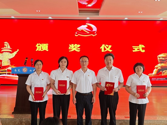 会议第三项,南充七中党总支副书记、校长黄亭婷宣读了《中共四川省南充市第七中学总支部委员会关于表扬南充七中优秀党务工作者、优秀共产党员的通报》文件。学校党总支书记苏小毅同志为受到表扬的优秀党务工作者和优秀共产党员颁发了荣誉证书。