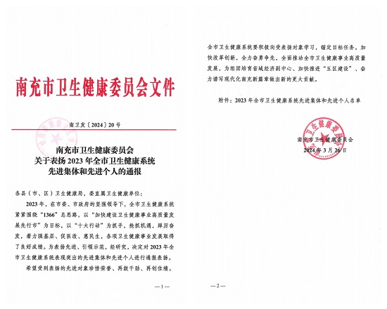近日,南充市卫生健康委员会发布了关于表扬2023年全市卫生健康系统先进集体和先进个人的通报,对2023年全市卫生健康系统表现突出的先进集体和先进个人进行了通报表扬。首都医科大学附属北京安贞医院南充医院、南充市中心医院(下简称:安贞南充医院)始终干在实处、走在前列,2023年度工作成绩斐然,再次得到市卫健委高度认可,获得多个殊荣: