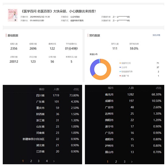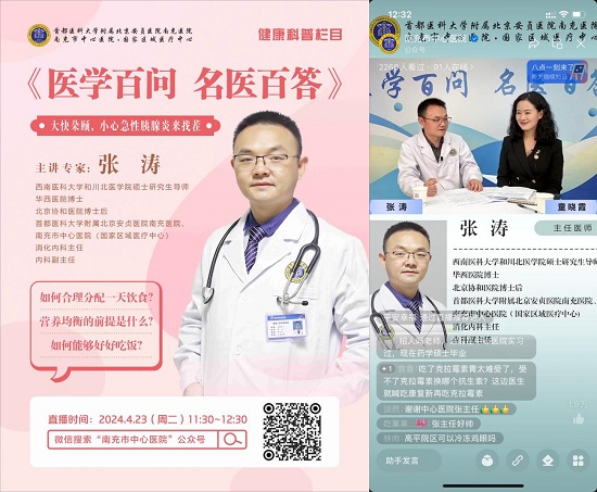 本次直播特邀消化内科主任、内科副主任张涛博士作为宣讲嘉宾,直播由全科医学科童晓霞医生主持。两位专家以“大快朵颐,小心急性胰腺炎来找茬”为主题,通过知识讲解、抽问回答等形式多样的直播方式,与屏幕前的了患者及广大网友进行了积极互动。在各直播环节,他们用风趣幽默的语言将专业严谨的健康知识变得通俗易懂,将很实用、接地气的健康知识推送到了患者及广大网友的手机屏幕前。