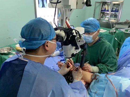 “仔细清创,上骨科器械,准备显微镜......”7月28日晚22时,在麻醉科、手术室、输血科等多学科密切配合下,手显微外科医生团队紧张地为患者接骨续筋,把离断的骨骼、肌腱(肉)、神经、血管一一复位,重建连接。手术最困难的环节莫过于吻合动静脉和神经,其吻合的质量直接影响断肢的成活率。主刀医师李用兵全神贯注,使出“绣花针”的功夫,借助放大15倍的电子显微镜,用细如发丝的显微外科专用缝线小心吻合断裂的血管,修复神经,历时5小时奋战,终于在凌晨3点顺利完成手术,患者断裂的右前臂肢体颜色也由苍白变红润,术后即转入重症医学科监护治疗。