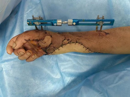 由于大量失血及断肢再植后再灌注损伤等原因,患者术后生命体征极其不稳定,再植肢体也面临坏死风险。重症医学科团队接力展开积极治疗,密切关注患者病情变化,通过维持血容量、保持断臂血流灌注、保护肝肾功能等措施,促使离断肢体血运稳定。经积极治疗,2日后成功转入普通病房。
