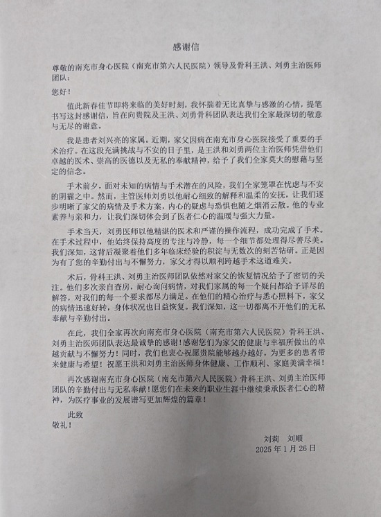 家属在信中深情写道:“我们全家再次向南充市身心医院骨科王洪、刘勇医师团队表达最诚挚的感谢!感谢他们为家父的健康与幸福所付出的卓越努力!同时,我们也衷心祝愿医院越办越好,为更多患者带来健康与希望。”