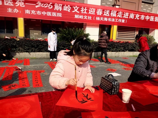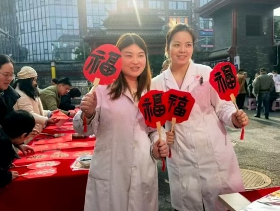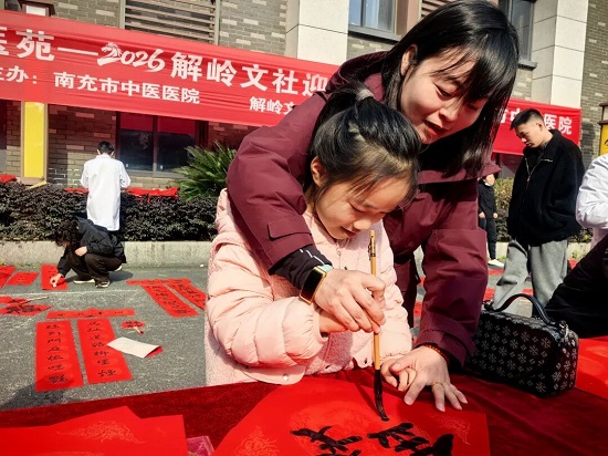 书写体验区,不少孩子在志愿者指导下,第一次拿起毛笔写“福”字,稚嫩的笔触里满是认真,欢声笑语中,中医药文化与传统书法艺术薪火相传。活动共送出春联及福字240余幅,画扇200余把,每一笔都饱含着对马年新春的美好祝愿。