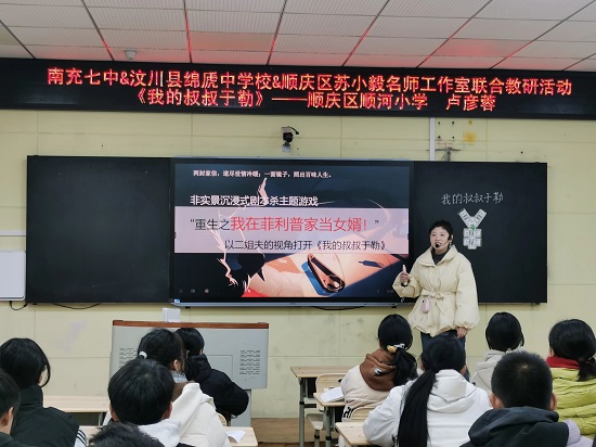 12月26日上午,根据活动安排,首先开展语文教学联合研讨活动。绵虒中学语文教师金干与顺庆区苏小毅名教师工作室成员卢彦蓉老师围绕九年级上册《我的叔叔于勒》一课进行同课异构。金老师以情节梳理、人物分析与写法探究为脉络,通过多元问题探究、文本细读与跨文勾连,贴合新课标理念。卢老师的课堂以剧本杀形式,借二姐夫侦探视角,引导学生圈点文本、推理探究,在沉浸式体验中落实语文核心素养。两堂课均获得在场师生的一致好评。
