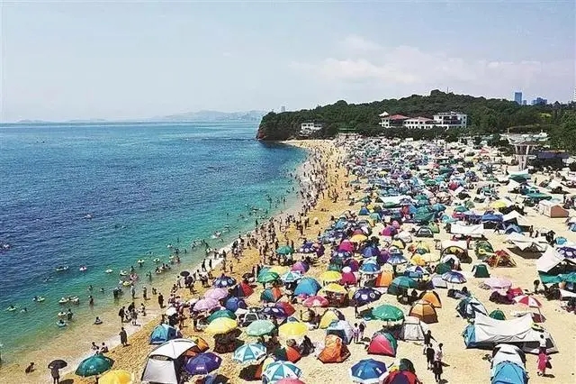 ▲大连傅家庄海水浴场迎来了避暑纳凉高峰期,五颜六色的帐篷把海滩装扮得艳丽多彩。