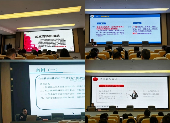 随后,秘书组组长张南阳、教育股股长杨善、督导股股长张越雄、秘书股股长何巧分别就公文流转的相关规范及注意事项、新闻的写作要素及新闻的格式要求、领导讲话稿的写作特点、撰写原则、撰写技巧与政务礼仪等内容进行培训,培训内容详实、事例丰富,与日常工作联系密切,具有很强的指导性,是对我局干部职工办文办会和公文写作能力的一次“集体充电”。