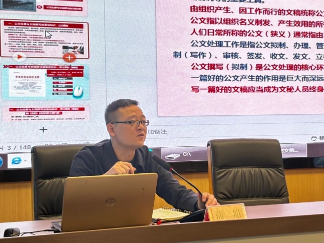 培训会上,蒲旭聚焦干部职工特别是年轻干部在公文写作方面存在的短板,就公文处理与文稿撰写的基础知识与方法技巧两方面,对公文的概念、种类、用途以及格式等进行了详细讲解,列举了近年来机关行文中出现的一些常见错误和不规范案例,通过展示事例、分析问题,从问题中找方法、从阐述中见经验,帮助大家加深了理解、掌握了要义。重点讲解了函、报告、请示、总结、简报等常用公文的格式、思路和结构。并结合自身工作经验细阐述了公文写作的常见问题和注意事项,传授了写作技巧。