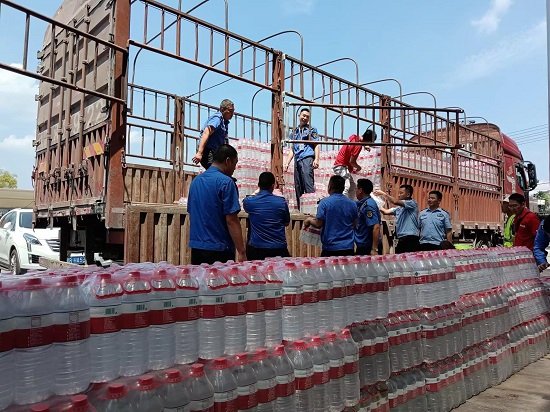 为给一线工作者消暑解热,农夫山泉公司和南充新鸿盛公司特地准备了1100箱共计11000瓶2升规格的爱心饮用水。上午11时许,农夫山泉公司和南充新鸿盛公司的工作人员来到潆溪街道便民服务中心,潆溪辖区公安、交警、城管、环卫以及项目建设的一线工作者早早等候在此。交接中,农夫山泉公司和南充新鸿盛公司相关工作人员向一线工作者辛勤付出表示感谢,并叮嘱大家要把安全放在第一位,注意劳逸结合,做好防暑降温工作。