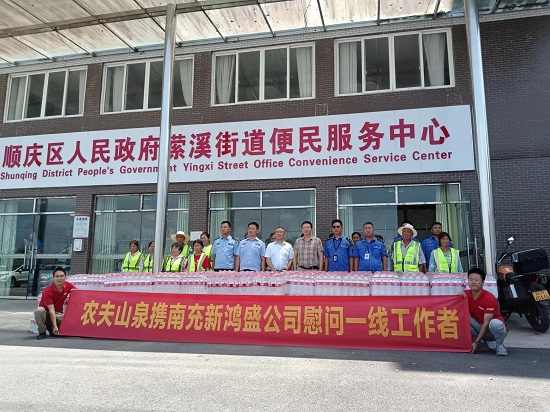 6月27日,农夫山泉股份有限公司南充办事处携手南充新鸿盛公司,向奋战在顺庆区潆溪街道、西山街道、共兴镇的一线工作者送去饮用水,致敬他们烈日下的坚守。