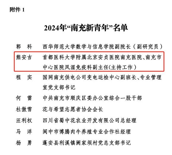 2019年,熊安吉博士以其卓越的能力被安贞南充医院引进,担任风湿免疫科副主任(主持工作)。5年来,他累计诊治病人近万余例,救治急危重症患者千余例,做到了治疗无差错、服务无投诉,成为了当地群众心目中响当当的名医,并带领科室成功创建四川省医学甲级重点专科、南充市临床重点专科。