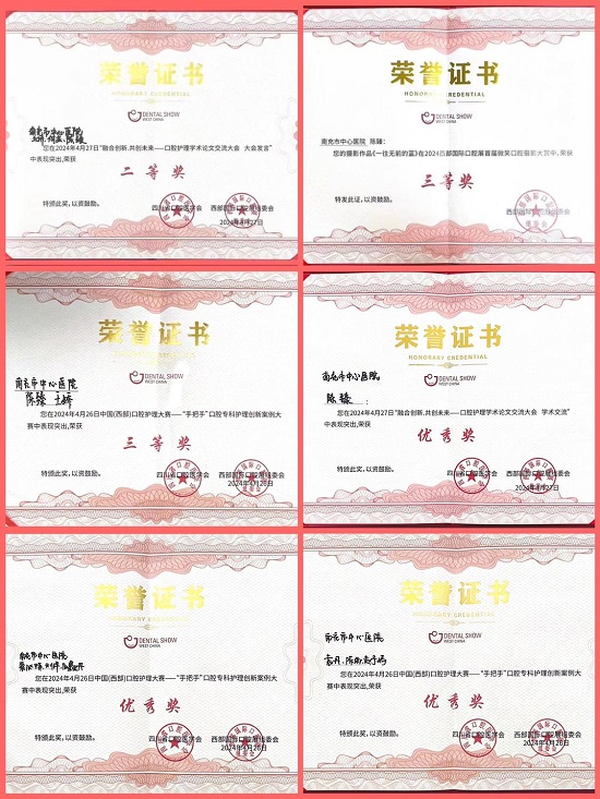 会议期间还举办了多场赛事,南充市中心医院口腔科表现出色,取得了优秀成绩。在西部国际口腔展-口腔护理学术论文交流大会中,以“融合创新·共创未来”为主题,向全国口腔护理同仁们征集了160余篇高质量的学术论文,涵盖了口腔护理新技术、护理管理、护理教育、护理人才培养以及口腔疾病护理疑难点等多个方面,经过严格筛选,最终有17篇论文在大会上发言交流,47篇论文以壁报形式展示,王娇同志凭借出色的成果荣获二等奖,陈臻同志获得优秀奖;在西部国际口腔展首届微笑口腔摄影大赏自公开征稿以来,受到各位口腔同仁热烈响应。30幅作品进入决赛,我科陈臻的摄影作品“一往无前的蓝”在摄影展中脱颖而出,荣获三等奖,展现了我院人才的卓越风采。 在4月26日盛大举行的第二十二届中国(西部)国际口腔医学学术会中,“手把手,口腔专科护理创新案例大赛”环节尤为引人瞩目。来自五湖四海的口腔精英,包括贵州、安徽、北京、广西、山西、四川、重庆、内蒙古等地的30家口腔专业机构及综合医院口腔科的60余位佼佼者,齐聚一堂,共襄盛举。经过激烈的角逐,陈臻、王娇两位同志凭借出色的表现荣获三等奖,蔡沁梅、刘洋、阳鑫丹,袁丹、陈雨、赵予嫣同志则荣获壁报交流优秀奖。