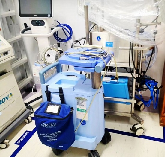 手术前,心外监护室将呼吸机、心排监测仪、IABP 机、ECMO 等生命监测和支持设备均提前准备就绪。主动脉内球囊反搏(IABP)是一种机械循环辅助装置。它能辅助心脏射血,减轻心脏负担。经临床研究发现,对高危冠脉搭桥患者术前预防性植入IABP,可有效降低死亡率、缩短住院时间、减少治疗花费,同时降低术后急性肾损伤与低心排综合征等相关并发症的发生率。