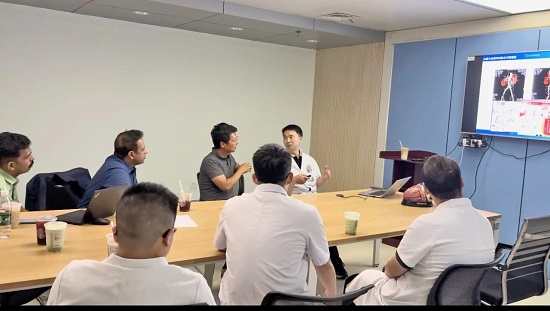 随后,双方在心脏大血管外科示教室进行了座谈。刘仕强分享了科室近两年来收治的疑难病例和完成的高难度手术,包括川东北地区首例“人工心脏”技术的应用、体外预开窗技术治愈高龄复杂腹主动脉瘤患者等。Dr. Rohit P.V Nair不时赞叹“amazing”。随后,Dr. Rohit P.V Nair分享了疑难病例,并就病例特点和手术方式进行了交流。