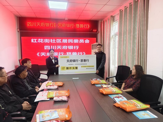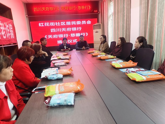 现场,四川天府银行南充西城支行为红花街社区居委会捐赠现金8000元,为社区10余名贫困户捐赠了米面油等日常生活用品。