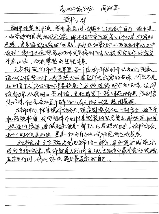 读书活动主题研讨会上,高一八班韦妍欣同学表示:“读书是拓宽视野的窗口,通过文字,我们能够穿梭于古今中外,领略不同时代的风貌,感受不同的地域文化。”周丽萍同学也说:“读书是一场奇妙的自我发现之旅,翻开泛黄的书页,墨香氤氲间,我遇见了无数个自己。合上书页,文字已然内化为生命的一部分。”
