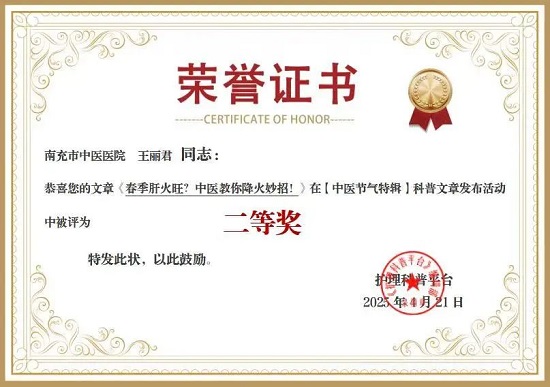 近日,南充市中医医院由护理科普平台主办的《中医健康与时令节气》专辑科普征文活动结果出炉,南充市中医医院内二科主管护师王丽君创作的科普作品《春季肝火旺?中医教你降火妙招!》从全国千余件参赛作品中崭露头角,荣获二等奖,为医院再添中医科普领域的亮眼成绩单。