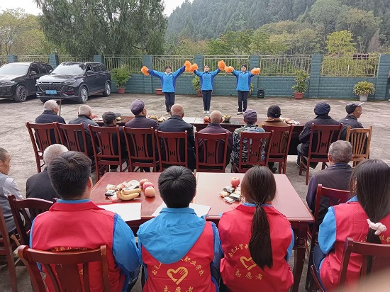 “爷爷奶奶们,重阳节快乐!”在文艺演出环节,主持人话音刚落,舞蹈《啦啦操》便惊艳开场。她们身着蓝色的校服,衣袖轻扬间,每一个旋转都精准到位,将传统舞蹈的韵味展现得淋漓尽致。歌曲、朗诵、舞蹈轮番上演,更是让台下老人不时拍手称赞,脸上洋溢着幸福笑容。表演结束后,大家还将亲手制作的贺卡、水果、糕点等送到老人手中,用纯真行动传递敬意。