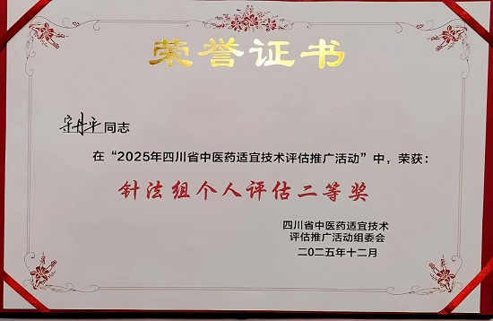 近日,2025年全省中医药适宜技术评估推广活动在成都圆满收官,南充市中医医院推拿科医生宋丹平作为南充代表队成员参赛,凭借过硬实力斩获针法组二等奖,充分展现了本院中医药人才的专业素养与技术实力。