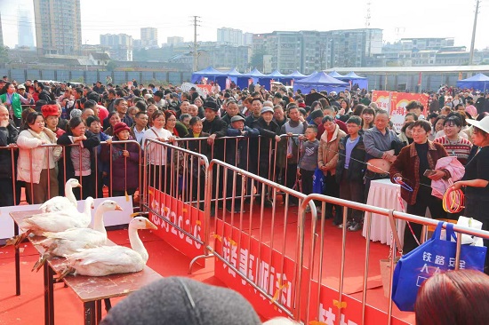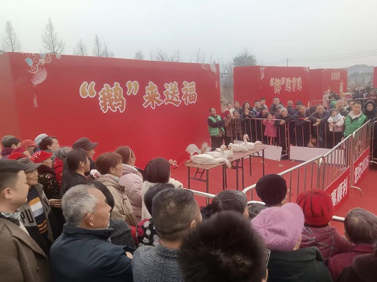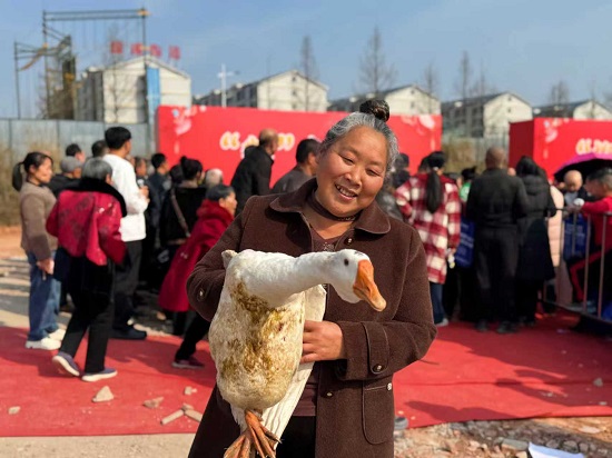 民俗表演意犹未尽,趣味游戏同样精彩。其中,“鹅来送福”游戏前人气爆棚、排起长队,成为整场游园会的“网红打卡点”。参与居民手持两个圈圈,凝神静气地站在指定线外,目光紧紧锁定围栏内可爱的大鹅,调整呼吸、找准角度,果断将圈圈投掷出去。大家纷纷拿出看家本领,有的稳稳投掷、有的反复调整角度,只为赢得这份独特的新春礼物。每当有人套中成功,现场便响起阵阵欢呼与喝彩,幸运的居民当场抱着胖乎乎的大鹅,脸上洋溢着掩饰不住的收获与喜悦,这份接地气又有心意的新春礼物,让幸福感直接拉满。