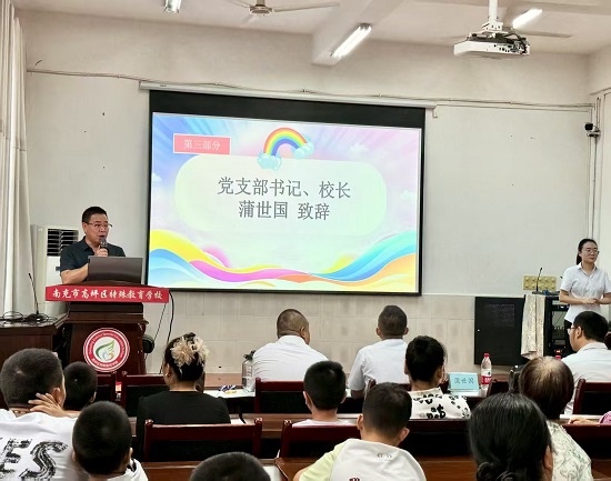 上午9时,开学典礼在庄严的国歌声中拉开序幕。学校党支部书记、校长蒲世国发表了深情的新学期寄语。他首先代表学校向新老学生表示热烈欢迎,并回顾了学校过去一学年的辉煌成就。他动情地寄语老师们:“特殊教育是‘太阳下最富人性美的事业’,它从生命本意出发,尊重残疾儿童的生命权利,发掘他们的生命价值。让残缺的生命在教育中绽放完美,让柔弱的生命在教育中焕发生机。”同时,他勉励同学们在新学期里学会自理、关心他人、互助友爱、文明礼貌,努力成为品学兼优的好学生。