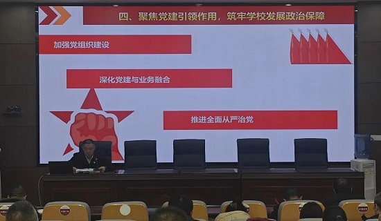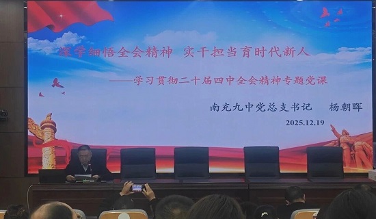 为深入学习领会党的二十届四中全会精神,切实把思想和行动统一到党中央决策部署上来,12月19日下午,南充九中党总支举行党的二十届四中全会精神宣讲会,学校党总支书记杨朝晖同志讲专题党课,为全体党员干部作专题辅导报告。