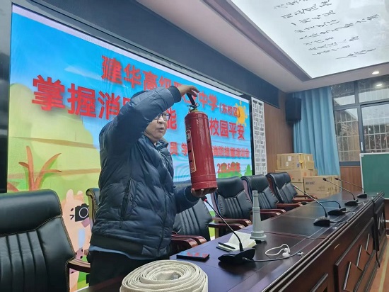 随后,黄小虎校长以“火情当前,如何应对”为主题,为参训人员传授了火灾应急处置的“黄金法则”。他强调,遇火情首要保持冷静,快速预判火势大小:小火初起时,可利用身边水源、灭火器、消防栓等器材及时扑救;若火势失控,需严格遵循“低姿、捂鼻、贴墙”原则,沿疏散通道快速有序撤离,到达安全地带后立即报警,清晰说明火灾地址、火势情况及被困人员信息。这些贴近校园生活的应急策略,为师生们配备了一把危急时刻打开生命通道的“金钥匙”,赢得了现场阵阵掌声。