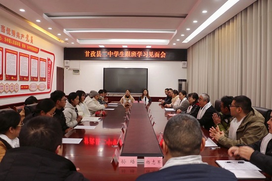雪域连果城,藏汉一家亲。1月10日上午,南充龙门中学举行甘孜县二中跟班学习见面会。学校领导班子、相关科室负责人、跟班班级班主任及科任教师与6名藏族学生和家长齐聚一堂,共赴这场跨越山海的教育之约。见面会由党委副书记唐兵主持。