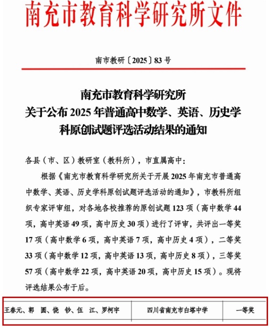 近日,南充市教育科学研究所公布2025年南充市高中数学原创试题命题比赛结果,南充市白塔中学高中数学组王春元、郭圆、饶钞、伍江、罗柯宇五位老师组队参赛,在全市44个组的激烈角逐中脱颖而出,荣获一等奖。