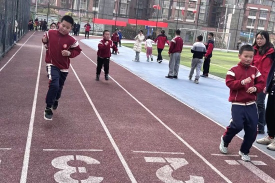 竞技场在发令枪响的瞬间化作生命跃动的海洋。听障组的50米赛道率先点燃战火——少年们弓身凝眸,如满弦之箭紧盯裁判高举的手臂,当红色旗帜劈空而下的刹那,十数道身影应声弹射,运动鞋与塑胶跑道擦出激昂的韵律。百米赛区更是上演心跳对决,决赛圈最后二十米,扎着红色头带的女生突然加速,飘扬的发梢在阳光下划出金色弧线,以0.3秒优势刷新个人最好成绩,终点线旁的手语老师激动得比出"冠军"手势。培智组的50米赛道同样热血沸腾,身着红色校服的小运动员们紧抿嘴唇,在老师的辅助下摆出标准起跑姿势。哨音未落,一个小胖墩已像旋风般冲出,虽然中途踉跄却始终紧盯前方,当他不慎跌倒又立刻爬起时,全场爆发出雷鸣般的掌声。终点处,提前等候的班主任张开双臂,将一个冲刺过线的自闭症男孩紧紧拥入怀中——这个曾经抗拒肢体接触的孩子,此刻正用通红的脸颊摩挲老师肩膀,汗珠在阳光下折射出彩虹般的光芒。据运动保健组组长杨昕琪老师介绍,这次比赛设计了分层达标机制,目的是让每个孩子都能找到适合自己的赛道。