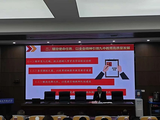 本次专题会议和党课,赋予了我们全体教师新的使命和新的任务,要求我们要立足南充九中办学实际,把全会精神转化为立德树人、教书育人的生动实践,转化为推动学校高质量发展的强大动力,努力办好人民满意的教育,为南充教育强市建设、为教育强国建设贡献九中力量。